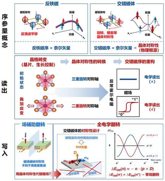 The team led by Cheng Song grew CrSb films, a new type of room-temperature altermagnet. The magnetic space group can be switched by the crystal distortion, thereby enabling control of the electrical read-out and write-in. They formulated a theoretical criterion for the all-electrical switching of altermagnetic order. Replacing the magnetic field with the unique crystal symmetry, they achieved the long-sought all-electrical manipulation of altermagnetism. Their work demonstrates that “altermagnetic order = Néel vector × crystal symmetry”, and provides the critical experimental evidence for establishing the altermagnets as a third class of magnetic materials, separated from ferromagnets and antiferromagnets. The relevant work was published in the journal Nature.