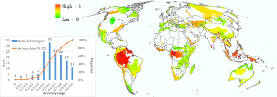 This study identified significant gaps of observation and land cover mapping of these critical terrestrial ecoregions (WWF Global 200) from space, i.e. (1) Only 18% ecoregions belong to research hotspots of land cover mapping (Figure 1); (2) Only 28 ecoregions have greater than 80% accuracy in a 30 m map, but another 36 ecoregions have poor than 50% accuracy in the same map (Figure 2); (3) The availability of Landsat TM/ETM+ data for those ecoregions is very poor (Figure 3). Therefore, data availability and accessibility remain a major challenge for the conservation community to fully utilize remote sensing techniques.