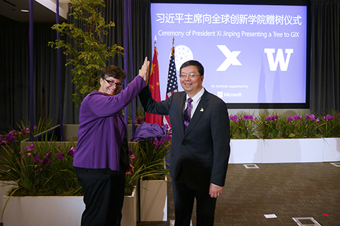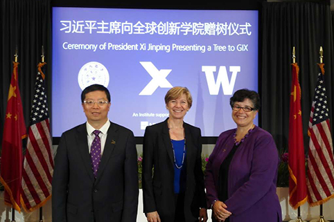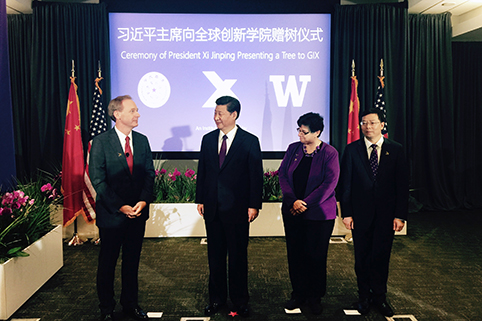 During his visit to Seattle, Chinese President Xi Jinping met with Tsinghua President Qiu Yong, University of Washington Interim President Ana Mari Cauce, and Microsoft President Brad Smith. President Xi presented a China originated sequoia as a gift to be planted at the new Global Innovation Exchange (GIX) facility. Peng Liyuan, wife of Chinese President Xi Jinping, participated in the event.