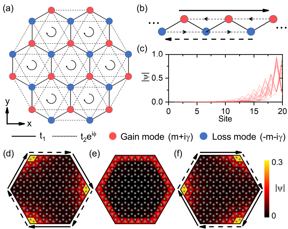 They found the hybrid skin-topological effect induced by gain and loss in two-dimensional systems. This kind of skin effect is selective, i.e., the bulk states and the edge states have different behavior. The bulk states are not affected by the skin effect and remain extended, while the edge states exhibit skin effect and are further localized to corners. This hybrid phenomenon of skin effect and topological effect shows the unique properties of non-Hermitian topological systems, which do not have Hermitian or nontopological analogs. As a specific example, they considered the non-Hermitian Haldane model with gain and loss [Fig. 1 (a)]. In the Haldane model, the topological edge states are obtained by introducing on-site energy and local magnetic flux. It is one of the two important models to realize the quantum anomalous Hall effect in condensed matter physics. They found that if staggered gain and loss are introduced into the nearest-neighbor sites in the Haldane model, the topological edge modes of the system will exhibit the skin effect and are localized to the corners, while the bulk modes are not affected. So, it reveals a hybrid skin-topological effect. By analyzing the lattice sites at the edges alone, this second-order skin-topological effect can be simplified to the first-order skin effect at the edges. In the simplified one-dimensional model, there are chiral edge currents due to the nonlocal magnetic flux introduced by the complex next-nearest-neighbor couplings. They are equivalent to non-reciprocal couplings, so the system exhibits the first-order skin effect [Fig. 1 (b) - (c)]. On the contrary, there is only local flux, and the non-reciprocity cancels out in the bulk of the system. So, the bulk modes are not affected by the skin effect. By adjusting the gain and loss of the system, the direction of edge currents can be changed, to control the direction of the skin-topological effect [Fig. 1 (d) - (f)].