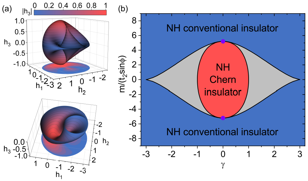 Fig. 2 The topology and phase diagram of the non-Hermitian Haldane model. (a) The surface S mapped from the first Brillouin zone, i.e., mapping from (kx, ky) to (h1, h2, h3). The color map represents the magnitude of h3. The density map below is the projection of the surface. The bottom figure is half of the top figure for h3<0. (b) The phase diagram. The red area is the non-Hermitian Chern insulator phase where C=1. The blue area is the non-Hermitian conventional insulator phase where C=0. The gray area is a gapless phase with EPs between two bulk bands. The black curves are phase boundaries. The purple points indicate the Hermitian phase boundary with the emergence of Dirac points.