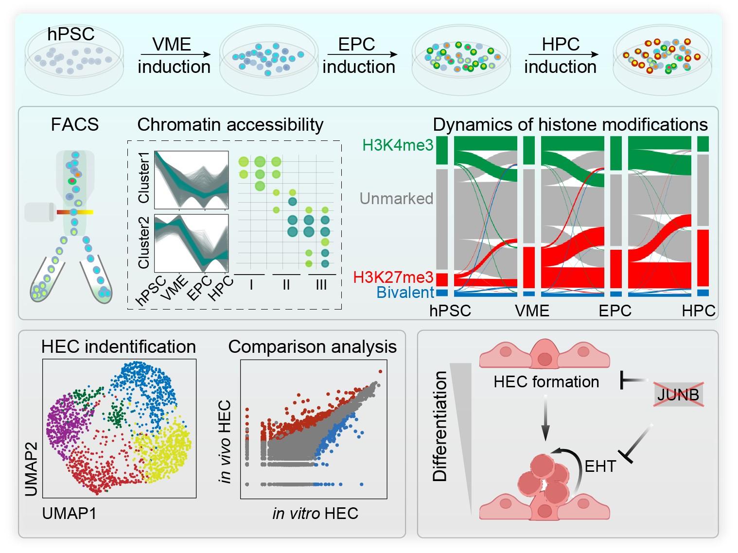 Hematopoietic stem cells (HSC) reside in the bone marrow and possess the ability to self-renew and differentiate into all blood cell types, and therefore hold great potential in cell-based therapies and regenerative medicine. In 2019, Zeng et al. reported the single-cell map of hematopoietic stem cells (HSCs) generated in the human embryo (Zeng et al., 2019). However, due to the inaccessibility of the early human embryo and minimal cell numbers, the epigenetic landscape, including genome-wide distribution of open chromatin and key histone modifications during HSC development, remained elusive. Human pluripotent stem cells (hPSCs) differentiation towards hematopoietic stem/progenitor cells (HSPCs) provides an in vitro experimental system to investigate the epigenetic regulation of human embryonic hematopoiesis.