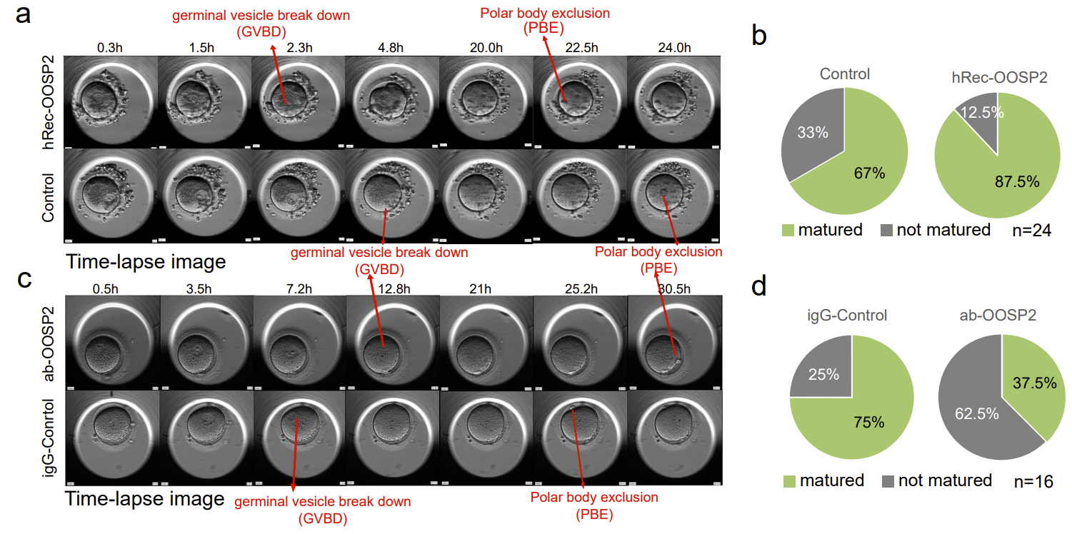 To explore whether OOSP2 has a regulatory role in oocyte maturation, the authors added recombinant OOSP2 proteins into GV oocytes collected from donors and monitored oocyte maturation using an incubator with time-lapse microscopy. Nuclear envelope rupture (GVBD) and polar body expulsion (PBE) are two stages of morphological changes after oocyte maturation under the microscope (Fig. 4). Oocytes are considered mature when PBE is observed. The authors compared paired GV oocytes from the same donor in each set of experiments to eliminate heterogeneity between different donors, and recorded the time to GVBD and the time to PBE of the experimental and control oocytes, respectively. The authors found that the addition of the OOSP2 protein increased the rate of in vitro maturation of human oocytes. In contrast, the addition of OOSP2 antibodies to the GV oocytes blocked the function of the OOSP2 protein, thereby inhibiting the maturation process of the oocytes.