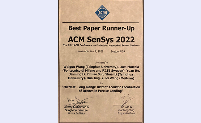 Associate professor Yuan He from the School of Software of Tsinghua University, together with his students and collaborators, won the Best Paper Runner-Up Award for their paper MicNest:Long-Range Instant Acoustic Localization of Drones in Precise Landing. This paper was co-authored by researchers from Tsinghua University, Meituan and the Polytechnic University of Milan. The research work was jointly supported by the drone group of Meituan, the Tsinghua University-Meituan Joint Institute for Digital Life, and the National Natural Science Foundation of China.