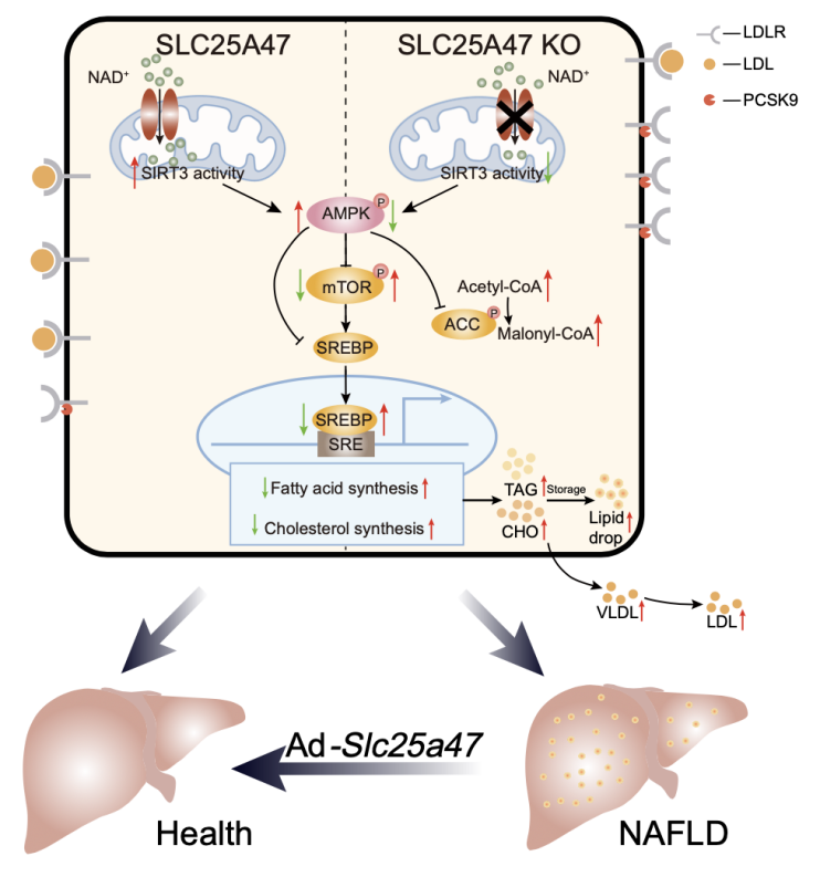 In addition, based on the results of the metabolomics testing in this study, and the virtual screening of the human metabolic database using a homology model of human SLC25A47 predicted and optimized by AlphaFold2, a series of candidate substrates were obtained, including NAD+, adenine, FAD, taurine, as well as various acylcarnitines, CoA, amino acids, etc. NAD+ was experimentally identified as one of the transport substrates of SLC25A47. SLC25A47 regulates the activity of SIRT3 by regulating the level of NAD+ to mediate the activation of AMPKα (figure 2). These findings indicate that SLC25A47 is a hepatic mitochondrial NAD+ transporter, which regulates lipid metabolism through the SIRT3-AMPKα-SREBPs pathway (Figure 3). In summary, this study provides a potential drug target for the clinical treatment of NAFLD and HCC, and provides further experimental evidence for the development of drugs or gene therapies targeting SLC25A47 transporter.