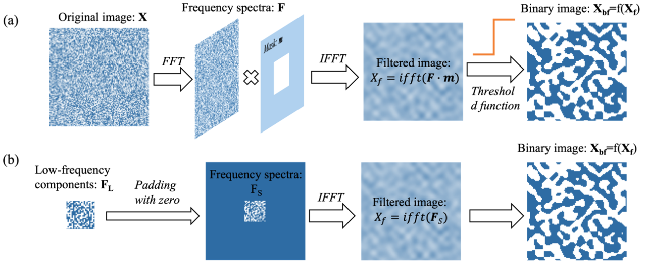 Inverse design is the process of pixelating the entire design area and determining the specific structure of the device through a goal-oriented optimization method. Considering the device processing requirements, isolated pixels and narrow gaps cannot be processed. Therefore, it is necessary to smooth the edge of the structure to meet the processing needs, which also makes some design degrees of freedom redundant. The Fourier low-frequency signal corresponds to the main structure of the device, while the Fourier high-frequency signal represents noise and rapidly changing information in the image. By using only the low-frequency Fourier component, the redundant design degrees of freedom can be reduced while controlling the minimum size of the device during the reconstruction of the time-domain image structure.