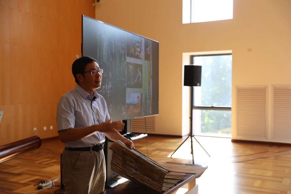 Liu Guozhong, deputy director of the Research and Conservation Center for Unearthed Texts, gives a lecture to the students.