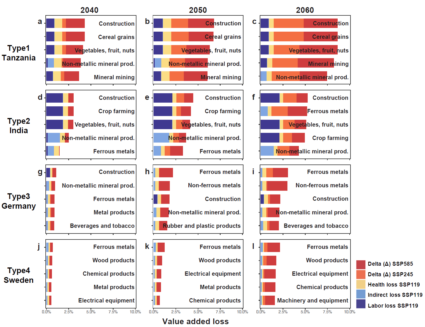 Figure 3 Top five industrial sectors with the most severe heat-related losses in four representative countries.