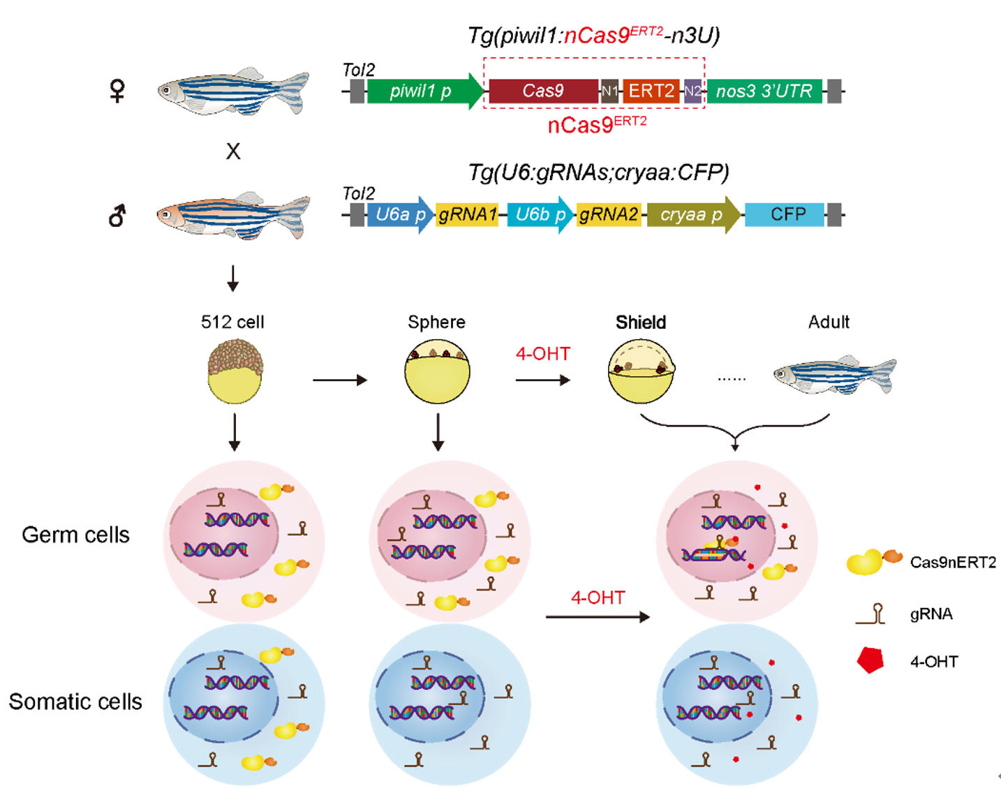 The schematic diagram of the zebrafish spatiotemporally inducible genome editing system and transgenic zebrafish lines.