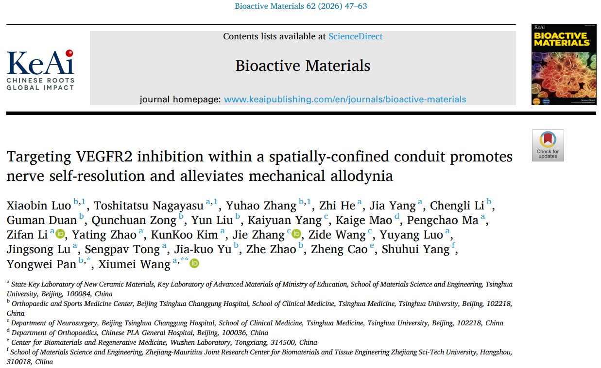 The findings have been published in the journal Bioactive Materials under the title "Targeting VEGFR2 inhibition within a spatially-confined conduit promotes nerve self-resolution and alleviates mechanical allodynia." Yongwei Pan and Xiumei Wang are the corresponding authors. Co-first authors include Xiaobin Luo (Tsinghua Shuimu Scholar postdoctoral fellow), Toshitatsu Nagayasu (master's student at the School of Materials Science and Engineering, Tsinghua University), and Zhang Yuhao (Ph.D. student at the School of Clinical Medicine, Tsinghua University/Beijing Tsinghua Changgung Hospital). This work was supported by the Beijing Science and Technology Project, the National Key Research and Development Program of China, the National Natural Science Foundation of China, and the Beijing Natural Science Foundation.