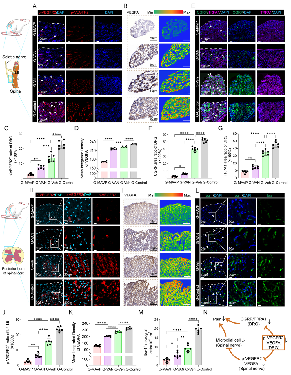 Mechanistic studies revealed that in a rat model of painful neuroma, targeted VEGFR2 antagonism further slowed axonal growth, inhibited reactive oxygen species release in vascular endothelial cells, reduced scar tissue hyperplasia, and indirectly decreased the expression of pain-related proteins (CGRP/TRPA1) in the dorsal root ganglia (DRG). It also suppressed microglial activation in the spinal dorsal horn, thereby significantly attenuating pain signal transmission in the central nervous system (Figure 3). By precisely modulating the residual nerve microenvironment, this strategy not only opens a novel targeted pathway for treating traumatic painful neuromas but also lays an important foundation for understanding the mechanisms underlying chronic pain after peripheral nerve injury, demonstrating significant potential for clinical translation.