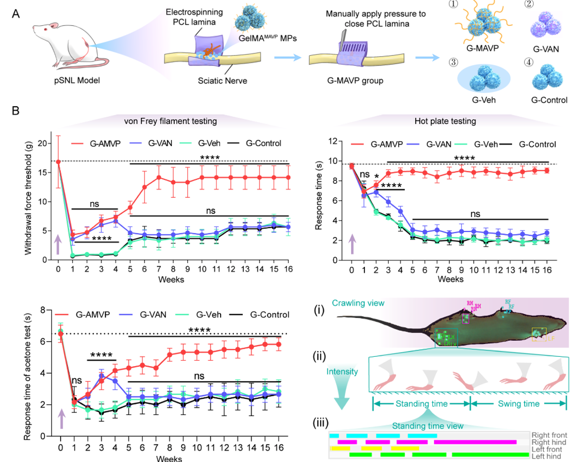 This study builds upon the team's previous research. The two teams had earlier developed a spatially confined nerve conduit and revealed its mechanism of regulating nerve growth and inflammatory microenvironment through the YAP mechanotransduction pathway (Nature Communications, 2025, 16(1):66). Based on these findings, the research team further introduced localized vascular inhibition signals, significantly improving allodynia behaviors—including mechanical, cold, and thermal pain, as well as gait abnormalities—in a peripheral nerve pain hypersensitivity model (Figure 2).