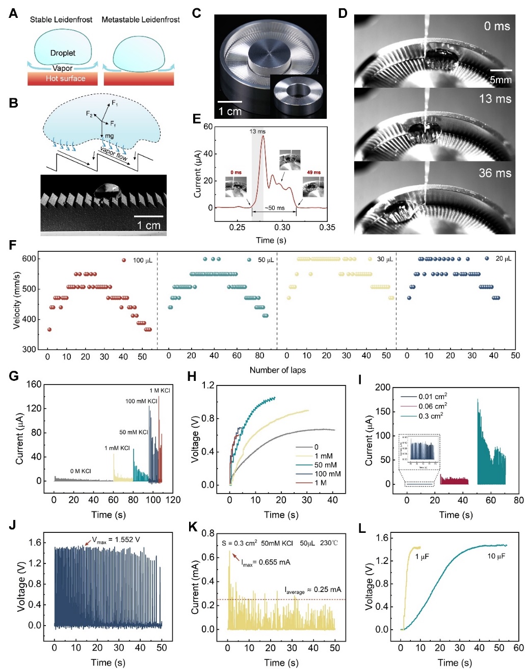 Recently, a team led by Zhou Li, director of the Vita Tech Innovation Center at Beijing Tsinghua Changgung Hospital, Tsinghua University, in collaboration with the University of Chinese Academy of Sciences and the Beijing Institute of Nanoenergy and Nanosystems, proposed a self-propelled power generation strategy based on the metastable Leidenfrost effect, starting from the fundamental mechanism of interfacial energy conversion. This provides a new research approach for the synergistic utilization of distributed low-grade thermal energy and water vapor. Accordingly, the research team focused on the dynamic control of the solid-liquid-gas triple-phase interface, exploring the motion characteristics and energy output behavior of droplets on the interface, and further developed a novel device that combines autonomous motion and power generation capabilities.