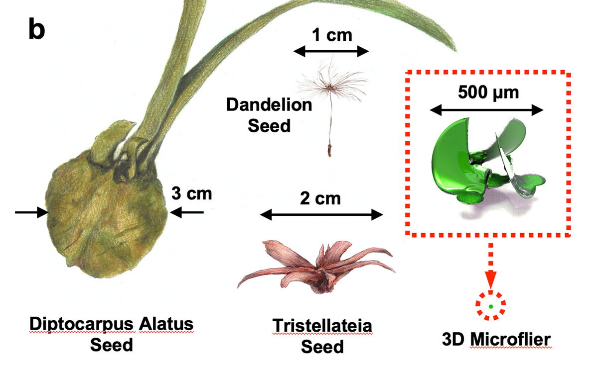 Shown to scale: the helicopter shaped seeds of Diptocarpus alatus and Tristellateia, a parachute type seed from a dandelion, and a 3D microflier.