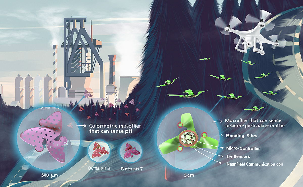 While the team hopes to focus more on IoT enabled fliers, they also looked into an example that used electronic alternatives – pH-responsive 3D mesofliers that use a color indicator based on anthocyanin infiltrated into a polycarbonate membrane. Aerial photographs of these sensors could be analyzed for monitoring purposes.