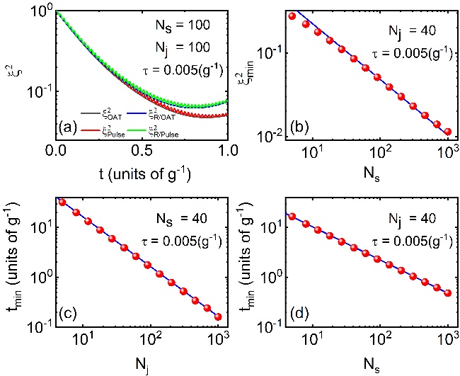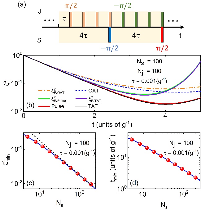 Fig. 3 Dynamic synthesis of TAT squeezing. (a) An illustration of the pulse sequence for the synthesis of TAT squeezing. (b) Evolution of the squeezing parameters for the TAT pulse scheme. (c) (d) The optimal spin squeezing parameter and the optimal squeezing time as functions of particle numbers Ns and Nj for the TAT pulse scheme, respectively