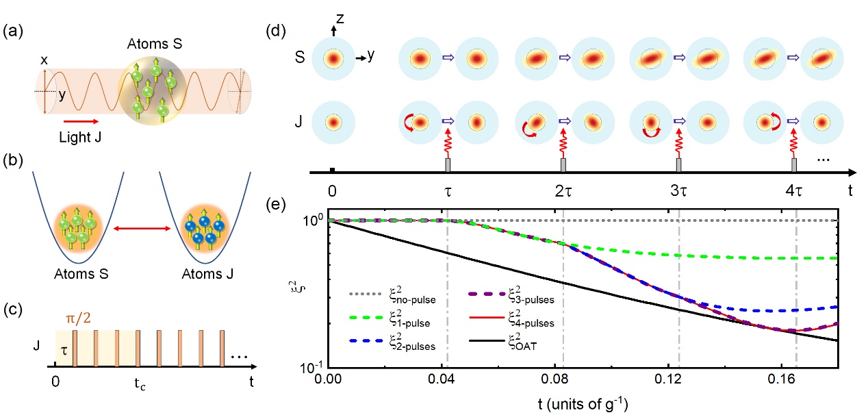 Fig. 1 Spin squeezing via dynamic synthesis. (a) Schematic diagram of atom-light interaction system with Faraday magneto-optic rotation. (b) Schematic diagram of dipole-dipole interaction system consisting of two atomic ensembles. (c) An illustration of the pulse sequence for the synthesis of the OAT squeezing. (d) Evolution of the quantum states for subsystems S (upper panel) and J (lower panel) during the first pulse cycle, represented by the Husimi Q function on the generalized Bloch spheres. (e) Evolution of the squeezing parameters for subsystem S when different number of rotation pulses are applied.