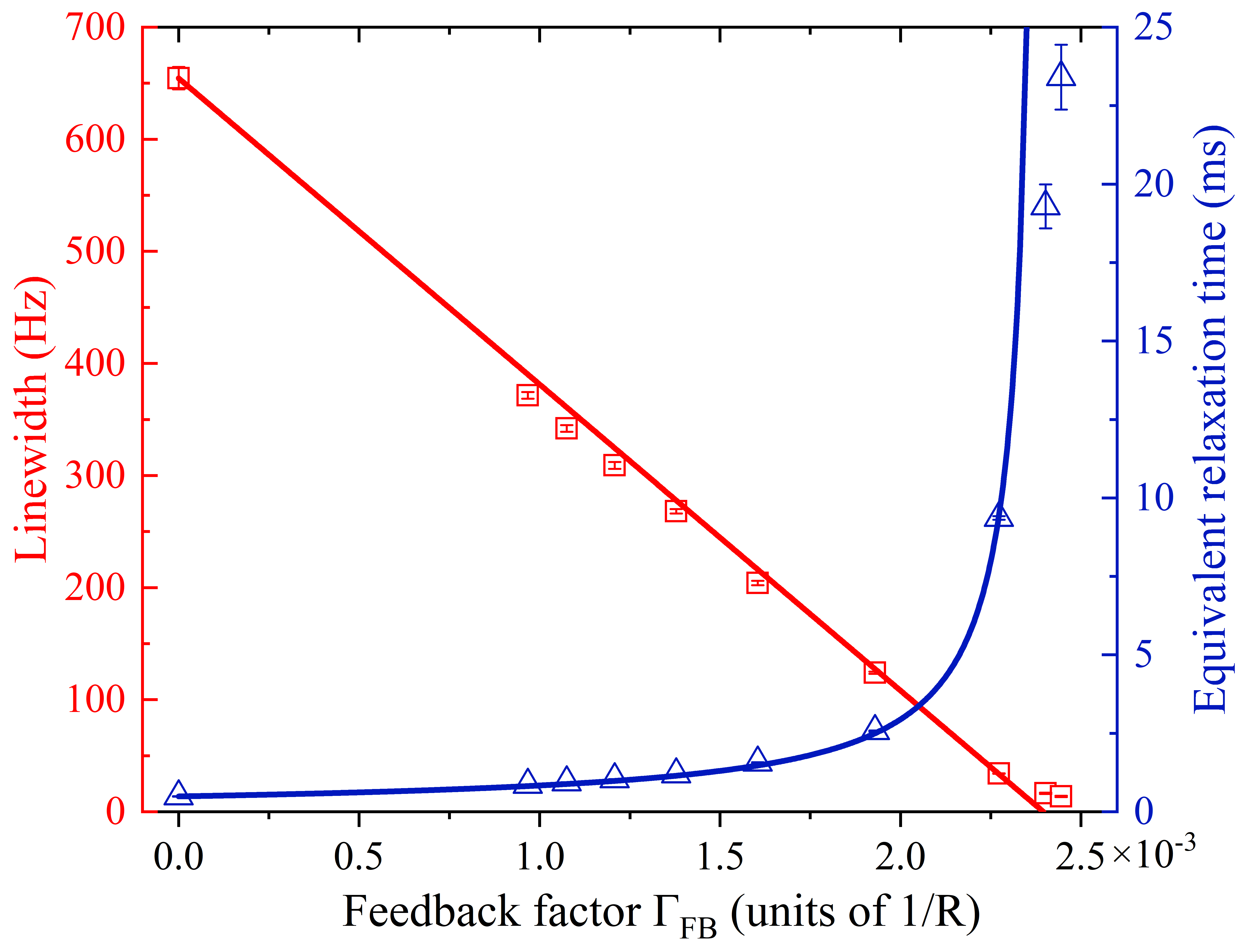 Fig.3. Dependence of linewidth and equivalent relaxation time on the feedback factor.