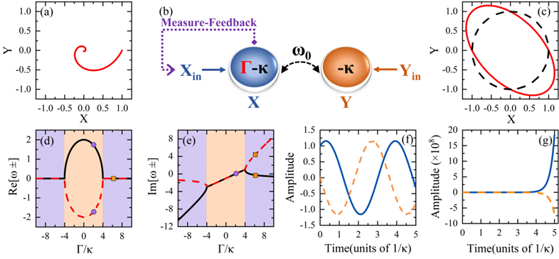 FIG. 1. (a) Typical trajectory of a dissipative resonance system in the phase space. (b) Schematic diagram of the PT -symmetric feedback system. (c) Phase-space trajectory of the PT -symmetric feedback system (red solid curve) and Hermitian resonance system (black dashed curve). (d),(e) Real and imaginary parts of the eigenvalues. (f),(g) Typical time evolution of quadratures X (blue solid curve) and Y (orange dashed curve) in PT -symmetric phase and symmetry broken phase.