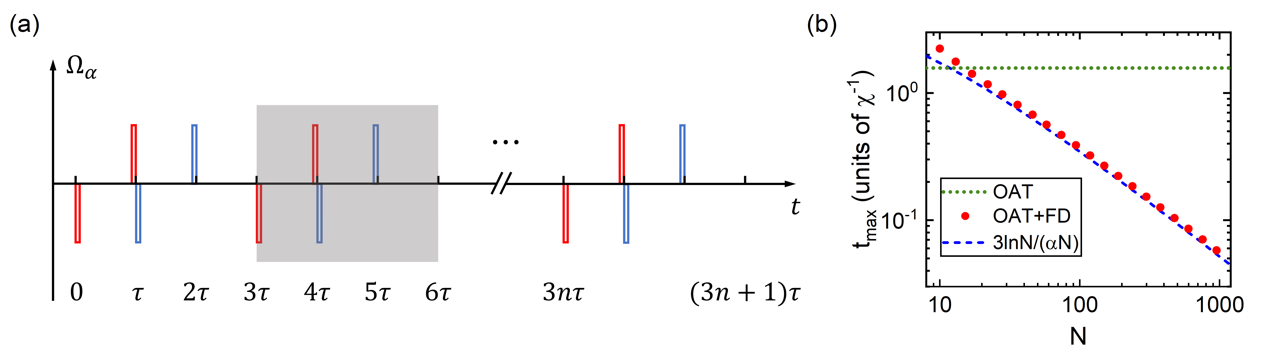 The researchers also proposed a pulse scheme to realize the XYZ model. By applying periodic rotation pulses along two perpendicular axes to the commonly existed one-axis twisting interaction, the spin state undergoes sequential three-axis twisting. The proposed pulse sequences are shown in fig. 2(a). The effective XYZ model is synthesized due to the noncommutativity of these three periods of evolution. In comparison to creating GHZ state directly with one-axis twisting interaction, the required evolution time of this scheme is inversely proportional to the particle number N and is greatly shortened, especially in the case of large particle number.