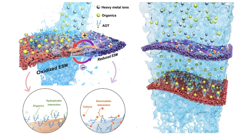 Targeting the coexistence of weakly polar organic pollutants and heavy metal cations in water, the research group has further introduced an amphiphilic dioctyl sulfosuccinate (AOT) molecule into the polypyrrole layer, fabricating an AOT-doped electrically controlled adsorptive membrane mediated by both hydrophobic and electrostatic mechanisms. Owing to the spatial orientation change of AOT molecules during the redox process of polypyrrole, the oxidized and reduced membrane surfaces expose the hydrophobic alkyl chains and charged sulfonate groups of AOT molecules, respectively, achieving a good single-pass filtration efficiency (>99%, taking 1-naphthylamine and Pb2+ as examples) and high permeability (227 L/m2/h). Applying a reversible potential can release the captured substances from the membrane, thus enabling membrane regeneration and self-cleaning without the need for additives. This research, entitled "Electrically Redox-Active Membrane with Switchable Selectivity to Contaminants for Water Purification", was published on Environmental Science & Technology, October 31, 2023.
