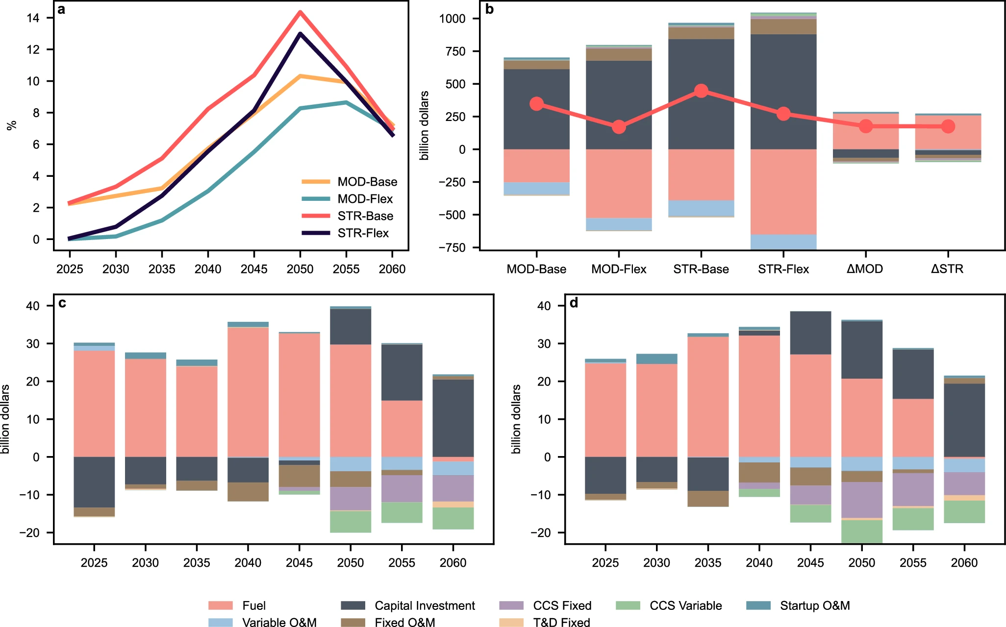 a The percentage of power system transition costs relative to the total system costs in the REF-Flex scenario; (b) the discounted power system transition cost components for the scenarios compared to REF-Flex; (c) the difference in cost components between MOD-Base and MOD-Flex by periods; (d) the difference in cost components between STR-Base and STR-Flex by periods. REF, MOD, and STR represent no, moderate and stringent emission caps, respectively; Flex and Base represent that coal power can be dispatched flexibly and operates as a base load, respectively. ΔMOD represents the difference in cost components between MOD-Base and MOD-Flex, and ΔSTR represents the difference in cost components between STR-Base and STR-Flex. CCS carbon capture and storage, T&D transmission and distribution, O&M operation and maintenance. Source data are provided as a Source Data file.