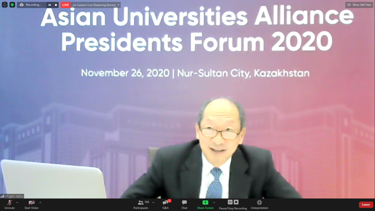 亚洲大学联盟执行主席、纳扎尔巴耶夫大学校长胜茂夫(Shigeo Katsu)回顾了纳扎尔巴耶夫大学建校10年来由一所学科单一的学院,发展为今天学科门类齐全、多元化发展、对标世界一流的大学的历程。他认为,在新冠疫情全球肆虐之际,亚洲高校校长们齐聚云端、共商高等教育发展意义重大,希望联盟成员学校依托校长论坛这一平台,继续深化对亚洲高等教育的探讨,促进各大学之间的合作,共同推动亚洲高等教育焕发出更加蓬勃的生机。