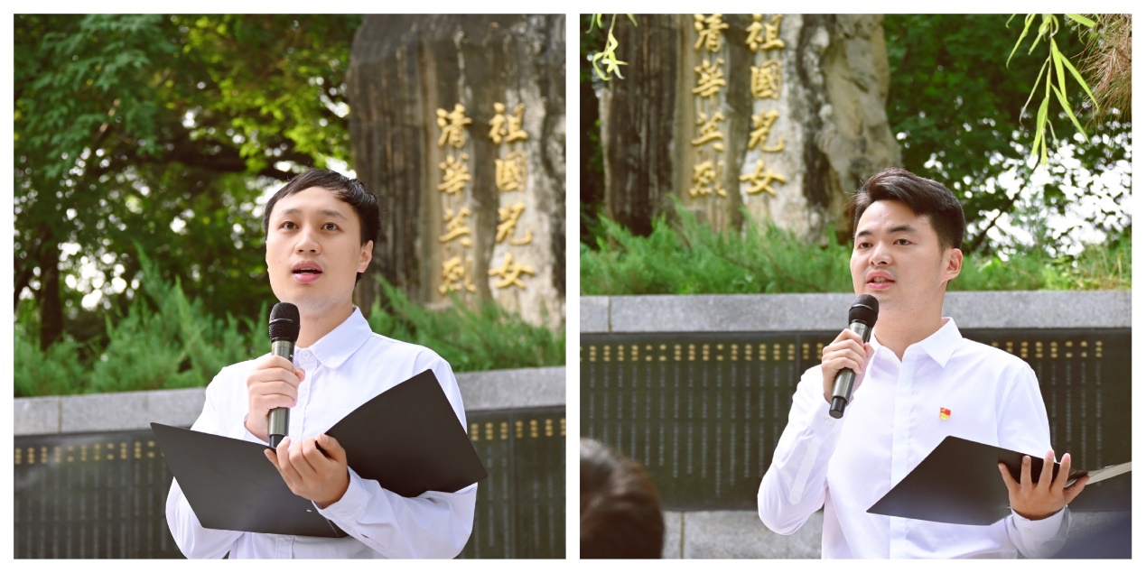在清华英烈碑前凝神驻足、缅怀先烈,聆听65位英烈的故事;