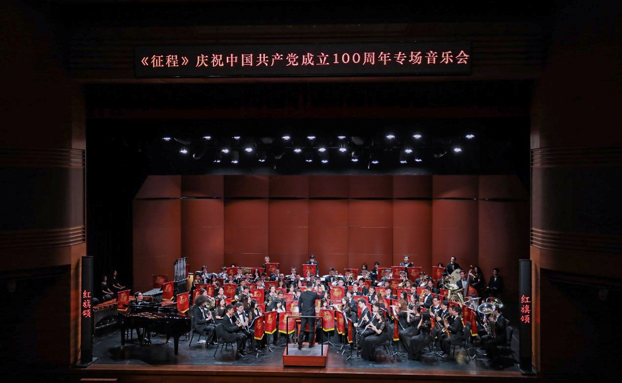 在“征程”专场音乐会上,军乐队演奏的《红军胜利到陕北》《歌唱祖国》等一批红色经典旋律响彻蒙民伟音乐厅。昔有号角陷阵,今有旋律铿锵,清华学子通过澎湃的音乐盛宴奏响昂扬向上的时代强音,赓续共产党人的精神血脉。