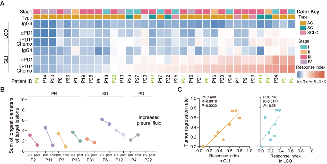 研究共建立了34例肺癌患者来源的GLI共培养模型,涵盖腺癌、鳞癌及小细胞肺癌亚型。通过评估免疫治疗(PD-1单抗或联合化疗)后的响应指数(Responseindex,Ri),发现Ri与患者实际临床疗效高度一致(R=0.89)。尤其在9例接受真实免疫治疗的患者中,GLI模型可准确区分临床部分缓解(PR)、疾病稳定(SD)和疾病进展(PD)人群。相比之下,缺乏PBMCs的类器官单培养模型(LCO)未能有效预测疗效,提示系统性肿瘤免疫的模拟对于准确反映临床免疫疗效至关重要(图3)。