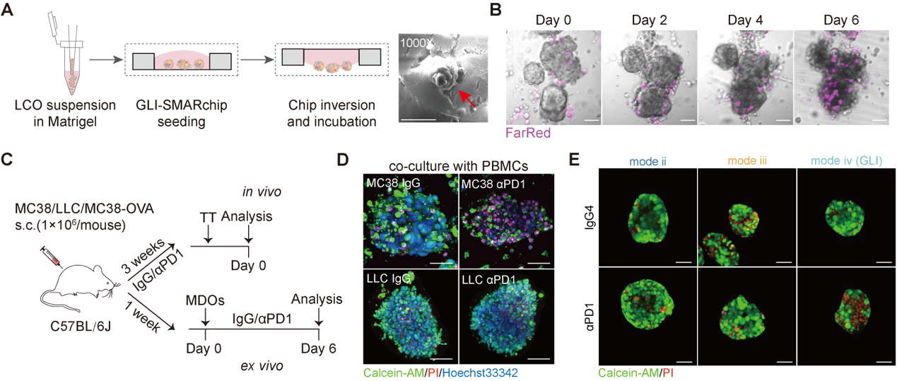 本研究设计了一种胶-液界面式超疏水微阵列芯片(Gel-liquid interface superhydrophobic microwell array chip,GLI-SMARchip),在1.5μL的液滴单元内构建LCOs与PBMCs的共培养体系。该模型使肿瘤类器官聚集于基质胶层表面,而PBMCs悬浮于上层培养基中,从而在胶-液界面形成稳定的空间接触,有效促进类器官与免疫细胞间的接触作用,从而模拟局部TME与系统性免疫细胞之间的协同关系。基于该策略所构建的小鼠及肺癌患者体外模型均呈现了良好的免疫细胞浸润与肿瘤免疫反应进程(图2)。