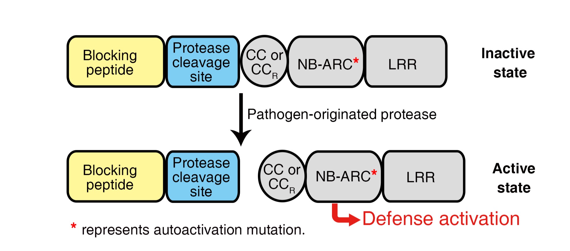 植物NLR免疫受体主要包括三类:TNL(TIR-NLR)、CNL(CC-NLR)和RNL(CCR-NLR)。TNL和CNL负责识别病原效应子,RNL在免疫信号传导中发挥关键作用。近年来的研究表明,CNL和RNL在识别病原入侵后可组装形成抗病小体,在膜上形成钙离子通道,激活免疫反应,这一过程依赖其CC或CCR结构域的氨基(N)端序列。因此,一个完整且游离的N端对其功能至关重要,与此一致的是,刘玉乐团队早在十年前就发现:在CNL的N端融合额外多肽会抑制其功能。另一方面,在NLR的MHD基序或其他关键区域引入特定突变,可产生自激活型植物NLR免疫受体(autoactive NLR, aNLR)。此外,全世界约45%的植物病毒编码其侵染所必需的蛋白酶——大量细菌、真菌、卵菌、线虫和刺吸式昆虫也依赖向植物细胞分泌蛋白酶致病。