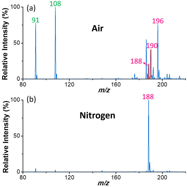 微液滴体系因其高比表面积、界面强电场和局部强酸性环境,近年来被证实可显著加速多种化学反应。本研究巧妙利用这一特性,在等离子体活化烷烃的基础上,进一步引入气态胺类化合物(如苄胺),使其与活化中间体共同被捕获至微滴表面,触发高效偶联反应。以环己烷与苄胺反应为例,在氮气氛围中,目标亚胺产物[C13H18N]⁺的生成效率显著提升,而在空气条件下则出现大量副产物(图2),凸显了气氛调控在反应选择性中的核心作用。
