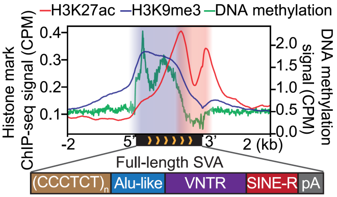 转座元件(Transposable Element, TE;又称为转座子transposon)是基因组中可以发生跳跃的DNA元件,人类基因组中的转座子序列约占45%。长期以来,转座子被认为是基因组中的“垃圾”序列,然而近年来越来越多的研究发现转座子对于基因组的结构、基因的表达调控等方面具有重要作用。已有研究提示其VNTR区域具有异染色质功能,而SINE-R区域具有增强子活性。然而,复合型转座子SVA元件上具有不同功能的区域及各自携带的染色质修饰在基因组上是如何被调控的,以及它们之间的协同调控如何影响SVA的转录及生物学功能,目前仍然未知。