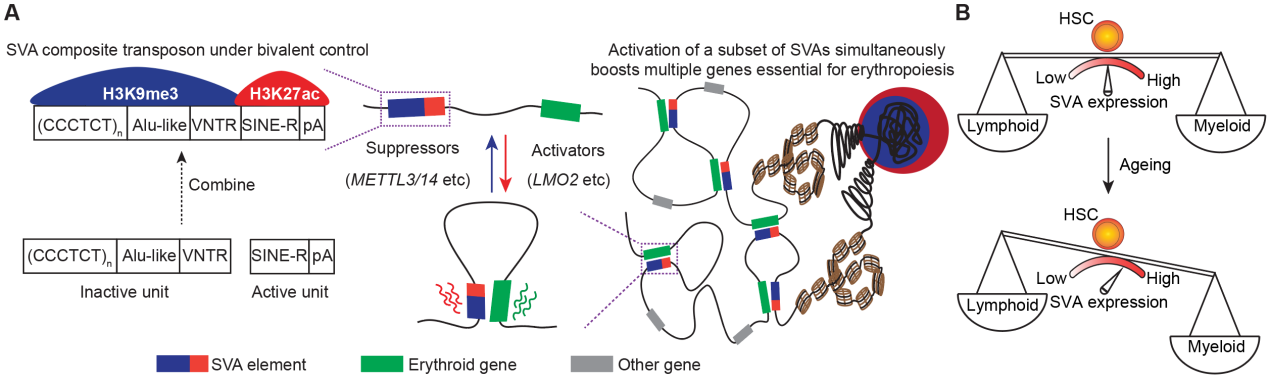 综上所述,研究发现了H3K9me3/H3K27ac标记的二价染色质富集在复合型转座子SVA的不同功能区域上,并且调控因子对二价修饰的协同调控可以动态精确地控制SVA的表达水平,进而调控SVA的增强子功能,最终影响造血系统分化和衰老。