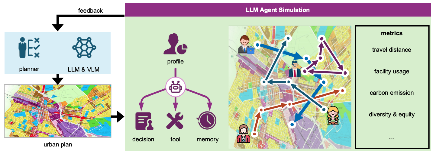 为了对规划方案进行科学评估,框架引入了LLM智能体进行城市动态模拟。研究团队为智能体设定不同的人口统计学特征(如年龄、职业),让它们在生成的虚拟城市中模拟居民的日常出行、设施使用等活动。通过分析这些模拟行为,可以得到关于交通距离、设施使用率、碳排放、社会公平性等多维度的量化评估指标,为规划方案的迭代优化提供科学、前瞻性的反馈。