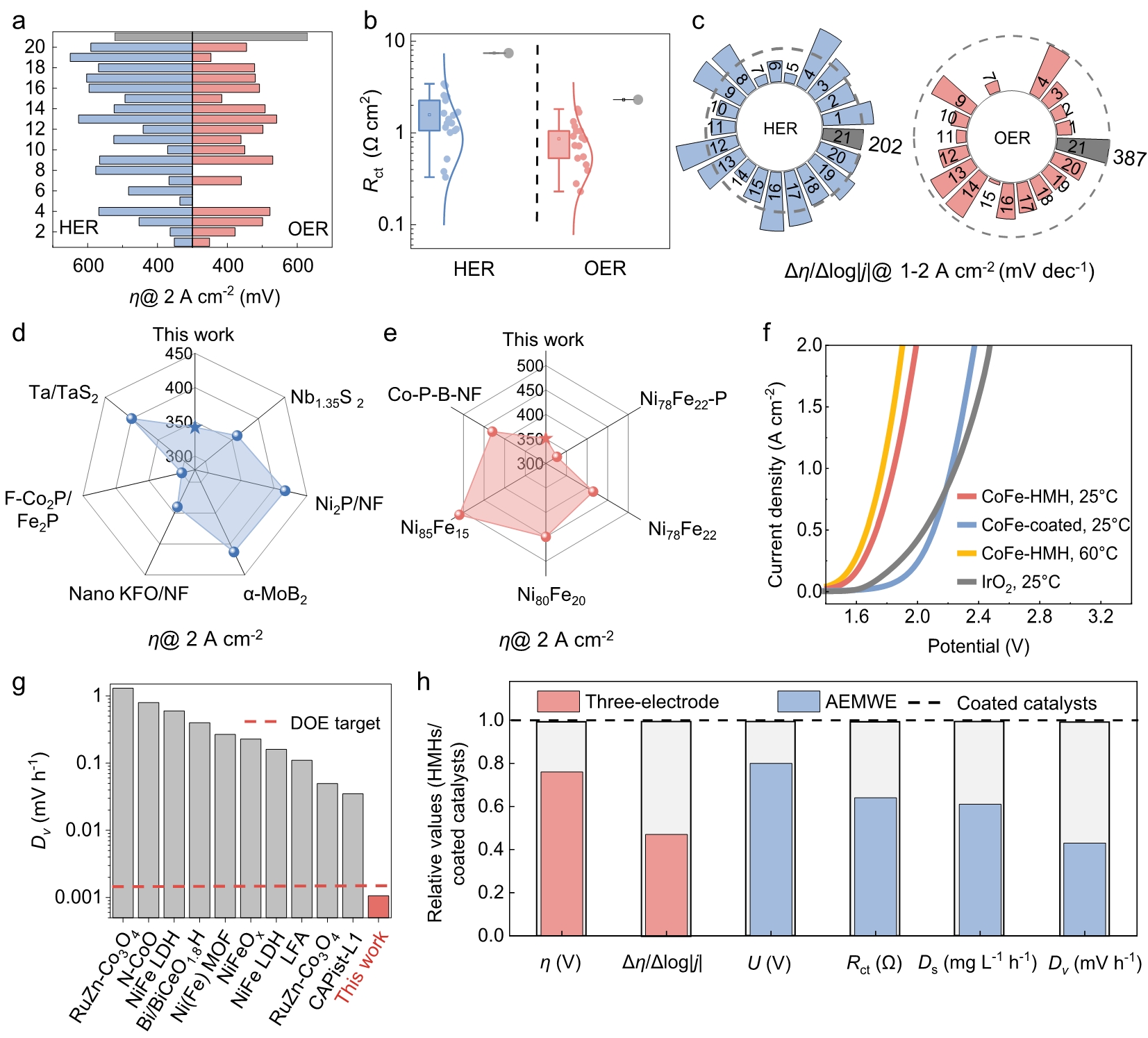 在该工作中,团队展示了同源金属材料的普适合成策略及四类材料的原子级分辨的晶体构型,证实该合成方法的高效与普适性(图1),利用积分相位衬度成像扫描电子显微技术以及微纳米划痕技术,证实了化学键合的金属性界面的存在,并揭示了化学键合的同源金属材料相比于界面弱相互作用的传统粘附型材料在界面电导和力学上的优异性(图2)。进一步地,研究通过原位光学偏振成像技术,实现了该类材料的高通量筛选和放大化制备(图3),所筛选得到的最优异析氢和析氧电极性能显著优于商业铂基催化剂,其组装的阴离子交换膜水电解槽实现了超千小时稳定运行,衰减率指标优于美国能源部2040年标准(图4)。这项工作为构建异质界面和厘清界面电导机制开拓了新策略,也为解决电子和能源器件中的界面电接触问题提供了新思路。