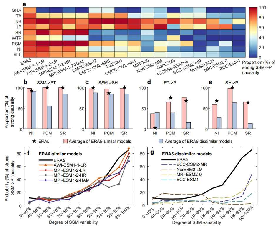 根据以上揭示的过程级耦合特征,研究评估了CMIP6气候模式的性能。结果表明,大多数模式无法再现SSM-P耦合的热点地区,并且导致模式表现差的子过程存在区域差异(图3a-e)。其中,表现较好的四个模式能捕捉到四至五个热点,也能再现ERA5中强土壤湿度变异性–强因果性的对应关系,而其他模式则不能(图3f-g)。因此,气候模式描述土壤湿度变异性与SSM-P因果性关系的能力,可以作为评价模式能否合理捕捉陆气耦合的指标。