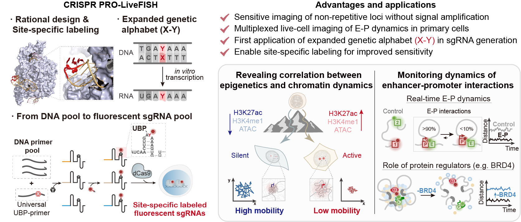 综上, CRISPR PRO-LiveFISH通过结合拓展遗传字母技术与sgRNA理性设计,为动态三维基因组研究提供了灵活高效的活细胞多色成像平台。该技术不仅适用于非重复DNA序列的动态标记,也可应用于原代细胞增强子-启动子互作的标记。 借助该工具,研究团队探索了染色质动态与表观遗传之间的相互关联、解析了增强子-启动子互作的时空特性,并阐释了转录共激活因子BRD4在维持超级增强子三维互作中的关键作用,从而深化了对表观调控和三维基因组时空动态调控机制的理解。