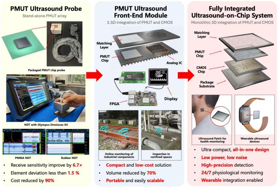 集成电路学院南天翔副教授团队的“下一代片上超声系统”项目获得银奖。该项目基于压电微机械超声换能器(PMUT)平台,围绕器件结构、系统工艺协同优化、阵列架构与集成方式等方面的创新,成功研制出高一致性、高性能的8英寸晶圆级大规模二维PMUT阵列,实现了高帧率实时三维超声成像。项目成果充分展示了PMUT在超声成像上的突出性能。依托其与CMOS工艺体系的高度兼容、低功耗、高集成度和可规模化制造等优势,团队构建的三维集成片上超声系统为下一代可穿戴超声设备和便携式医学影像系统提供了技术基础,推动超声影像朝小型化、低功耗和长期连续监测方向发展。未来,该技术将在心脑血管健康监测、器官功能评估、慢性病管理、早期筛查和重大疾病预防等场景中提供全新的解决方案。