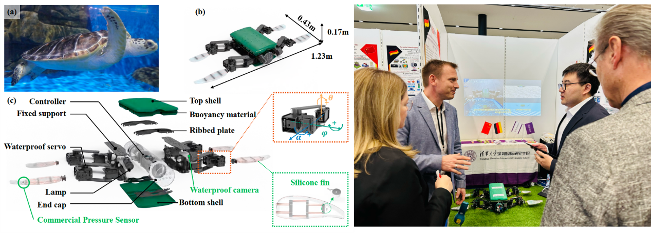 深圳国际研究生院曲钧天副教授团队的“融合视触觉感知的动态地形自适应两栖仿生海龟机器人”项目获得银奖。该项目设计了基于海龟生物原型的智能两栖仿生机器人,通过三大核心技术创新突破复杂环境适应瓶颈:采用三自由度仿生鳍肢与轻量化壳体设计;通过步态优化生成最小化运输成本的运动参数;研发视触觉融合感知框架,在视觉受限场景中的环境分类精度达99%。该机器人在实验室测试与野外实验中展现出速度与能效的双重提升。项目研发的机器人兼具环境适应性与任务扩展性,不仅为珊瑚礁采样等场景提供创新解决方案,其控制架构更可引领两栖机器人技术进入动态环境自主适应新阶段。