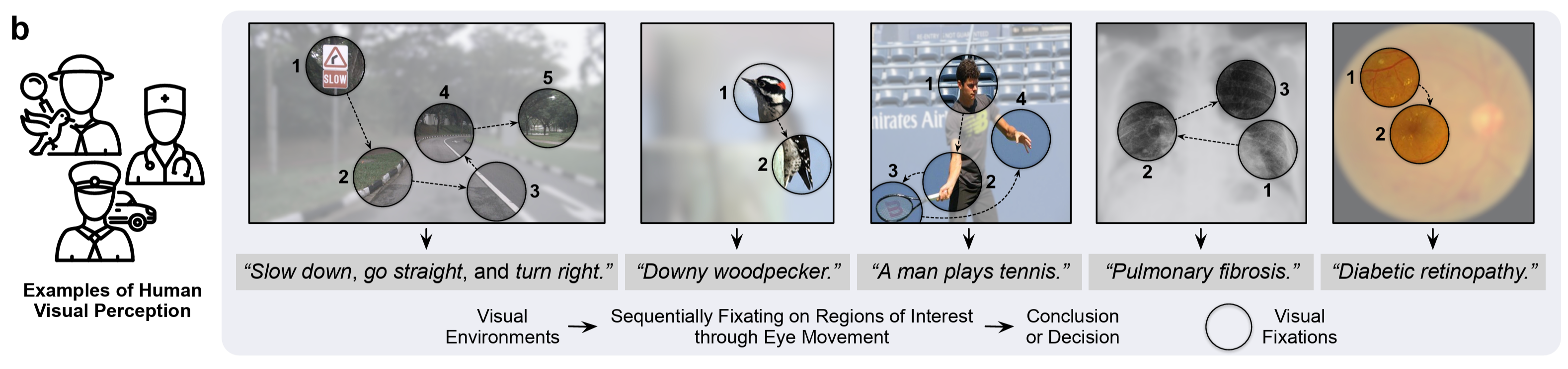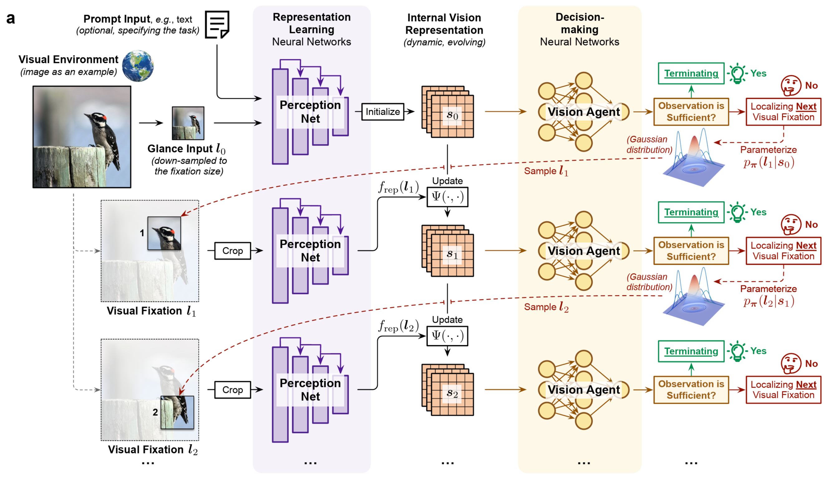 人类视觉系统能在庞杂的视觉输入中快速筛取要点,大幅降低冗余计算,使得人类高度复杂的视觉系统能够高效、快速运行。无论外界场景多么复杂,人类视觉系统的能耗主要取决于注视带宽与注视次数,而非全局像素量。早在2015年,深度学习三位主要奠基人杨立昆(Yann LeCun)、本吉奥(Bengio)和辛顿(Hinton)便指出,未来的AI视觉系统应具备类人的、任务驱动的主动观察能力。然而近十年以来,这一方向仍缺乏系统性研究。