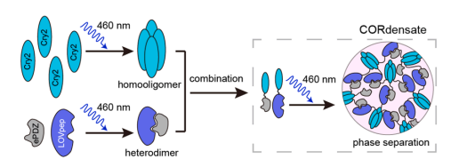 综上所述,研究构建了一个新的光控相分离系统CORdensate,可用于解析生物分子的相分离与其功能之间的因果关系。基于CORdensate的研究揭示了相分离在调控RTK信号中的重要作用,相分离比多聚化具有更高生物分子组织效率。