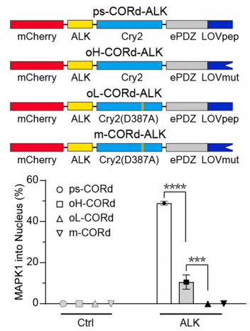 为进一步拓展工具应用场景,研究团队对CORdensate进行改造,将二元蛋白驱动体系优化为单链多肽驱动的相分离系统(ps-CORd);随后通过引入非活化型突变体Cry2(D387A)与LOVmut,成功构建另外三种单链光控开关(oH-CORd:高阶多聚体型、oL-CORd:低阶多聚体型、m-CORd:单体型)。这四种光控开关可实现生物分子四种组织模式的精准调控,为解析不同组织模式的功能差异提供了重要研究工具。