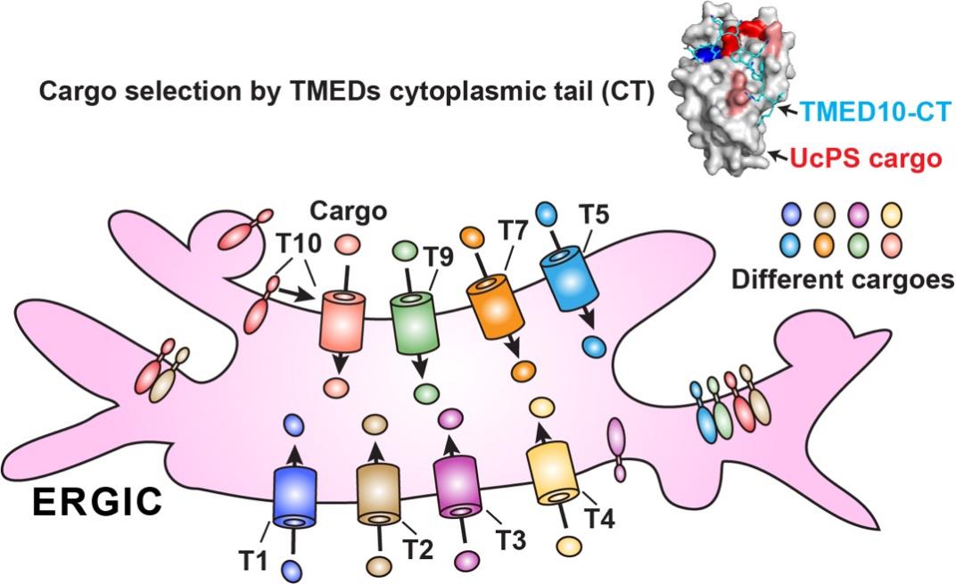研究团队首先发现TMED蛋白家族的多个成员都具有介导非经典分泌的活性,随后通过大规模的高精度分泌组学分析发现不同TMED蛋白对于不同货物具有特异的选择性。TMED家族成员能够直接在体外和体内介导非经典分泌货物跨膜转运进入囊泡,这一过程发生于内质网-高尔基体中间体(ER-Golgi intermediate compartment, ERGIC)上。进一步地,研究团队发现TMED蛋白的胞质侧结构域(cytoplasmictail, CT)可以选择性地结合细胞质内的非经典分泌货物,从而介导其选择性地跨膜转运,这一选择性识别—选择性跨膜转运—选择性分泌是TMED家族货物选择性的关键机理(图1)。