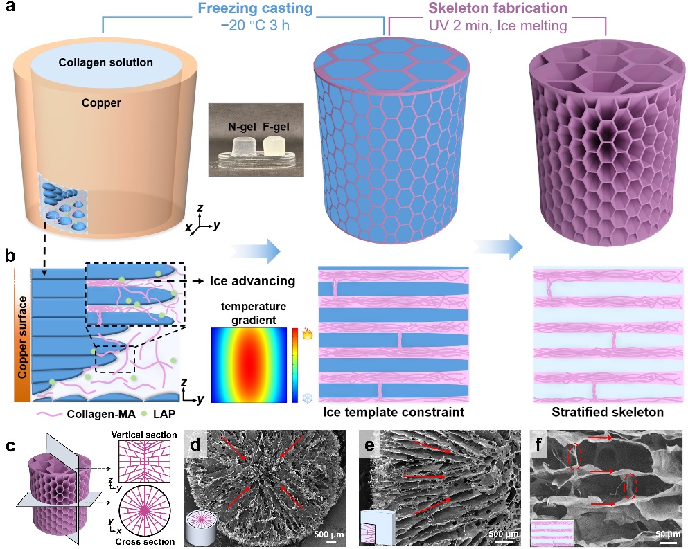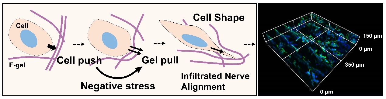 针对这一难题,91精品国产自产在线老师啪-国产一级农村无码-中文字幕无码人妻AAA片-人妻不敢呻吟被中出A片视频-好看的亚洲av日韩av在线播放深圳国际研究生院耿洪亚助理教授团队基于在低温生物工程和控冰技术方面的积累,开发了一种具有仿生天然细胞外基质的“负应力”效应的胶原蛋白水凝胶(F-gel),该材料能在外力压缩时,沿加载方向产生主动的牵引力(负应力),而非传统材料被动的抗压阻力(正应力),从而成功模拟天然ECM的牵引力信号,显著促进了神经细胞定向排列与深度浸润(图1)。