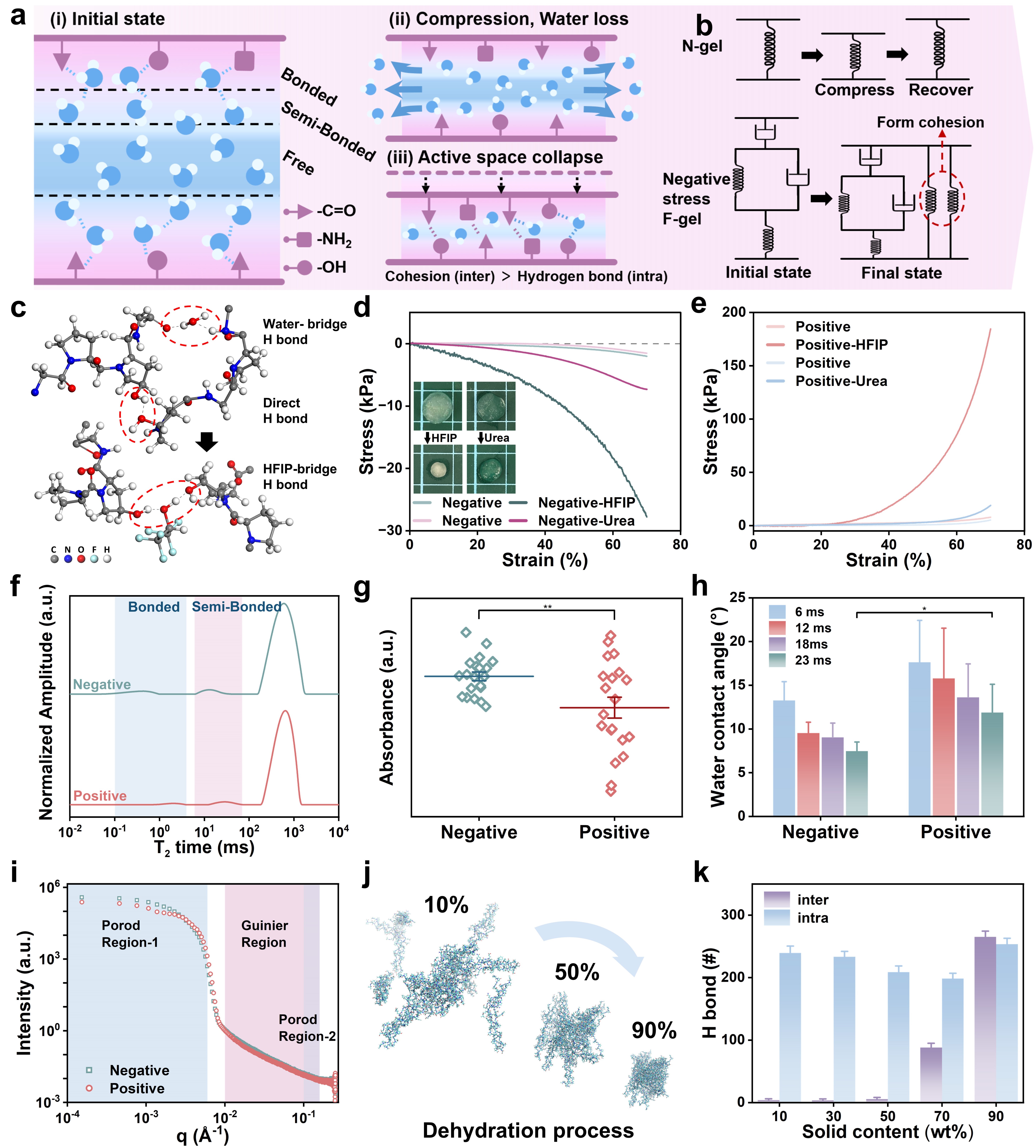 研究团队进一步揭示了负应力的分子机制:在分层网络中,水分子通过水合氢键在胶原链之间形成可调控的“水桥”交联。在外力加载下,低固含量的F-gel缺少层间桥接的限制,自由水被快速排出,链段靠近诱发水桥与分子间氢键协同重组,导致网络发生体积塌缩并释放出宏观牵引力,该机制通过一系列氢键调节实验和多尺度结构表征得到验证(图4)。研究还发现,该冷冻铸造策略可扩展至天然蛋白、天然多糖以及人工合成高分子等多种水凝胶体系,展现出良好的普适性。
