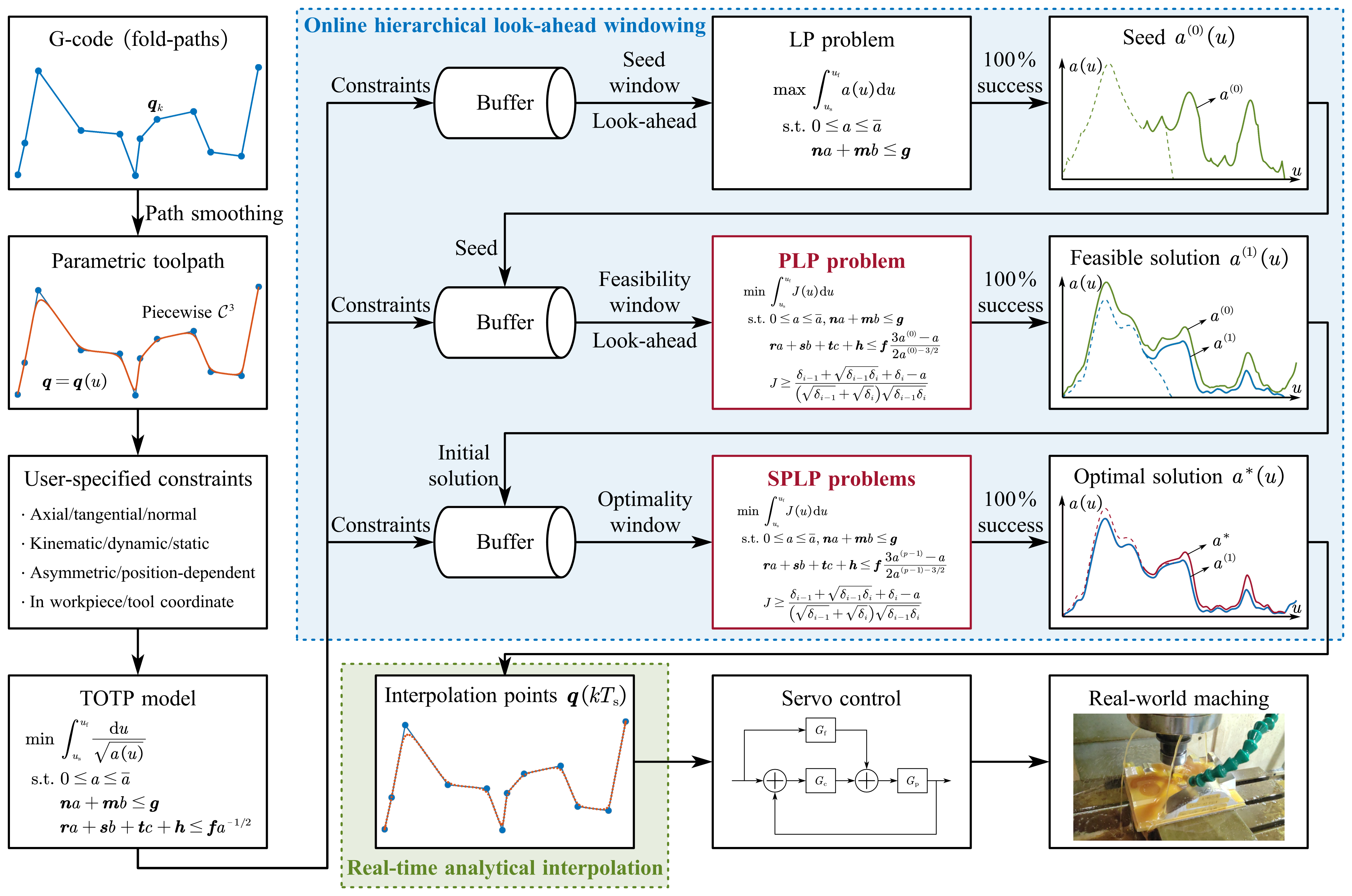 清华新闻网12月25日电 在高速高精数控加工中,轨迹规划的时间最优性、严格约束和在线规划稳定性是三个至关重要的性能,分别对加工效率、加工振动和实际可靠性有显著影响。实际应用中,商用数控系统通常要求轨迹光顺与插补支持在线执行,即“边加工边规划”,从而避免等待计算所引起的产率降低。目前,基于优化的轨迹规划方法能够严格遵循用户指定的约束,但面临两个挑战:一方面,计算成本和轨迹质量之间存在显著折中,在线优化方法难以在有限的计算资源内达成时间最优性;另一方面,现有主流在线轨迹优化框架缺乏约束可行性理论保证,从而制约了基于优化的轨迹规划方法走向可靠应用。