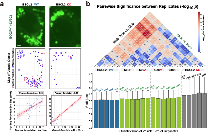 图2.扩展SynSeg框架用于疾病相关细胞定量分析。(a)BSCL2 野生型(WT)细胞,与基因敲除(KO)细胞荧光图像,表明该模型能够准确测量两种细胞类型中的脂滴(LD)尺寸。(b)BSCL2 WT、KO及四种错义突变体脂滴尺寸的定量比较与统计分析。热图呈现了所有生物学重复之间两两比较的结果,颜色越深表示被比较的两组之间的统计显著性越大