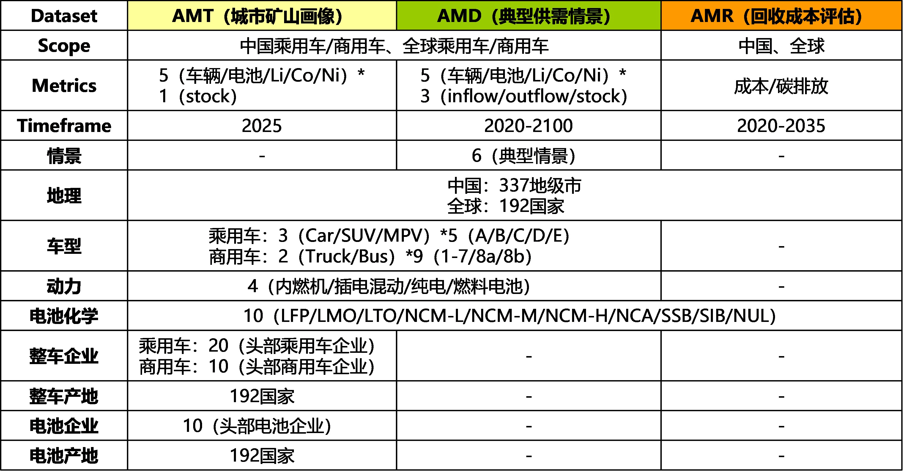 汽车城市矿山高分辨率画像数据集(AMS)对在用汽车内含关键材料(“城市矿山”)进行高分辨率画像(“勘探”),提供汽车城市矿山在地理(中国337地级市/全球192国家)、车型(15类乘用车/18类商用车)、动力系统(内燃机/插电混动/纯电/燃料电池)、电池化学体系(10类化学体系)、整车/电池生产企业(30家头部企业)、整车/电池产地(全球分国家)等维度下的存量估计。
